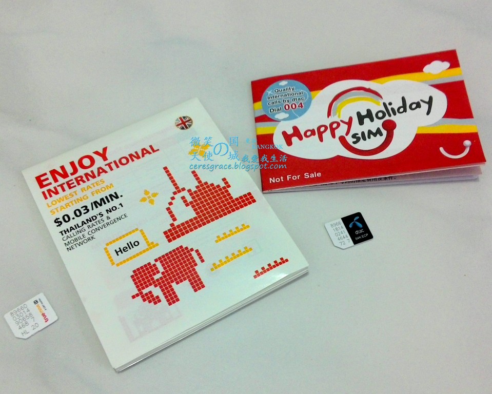 Happy Holiday SIM 是dtac电讯公司推出的旅游电话卡,卡内含有THB15的通话数额。一通简讯THB5,也可拨打国内与国际电话,至于话费我就不清楚了,在泰国各大便利商店都可以加额。